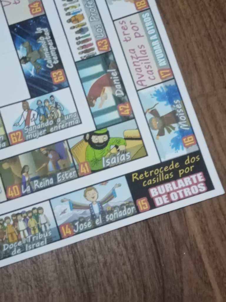 Once we laid out the general idea, the graphic designer, Marco Iván Portillo Noriega, put his talents into action. After exploring many options and styles for the game, we decided each square would make reference to Bible stories from both the Old and New Testaments, with the objective of getting players interested in what each Bible story is about. At the same time “reward” and “setback” squares were included, emphasizing that good values help us while bad habits harm us. Our hope was that the game would promote moral values in children in particular, so that they might begin to equate their good and bad actions with the subsequent consequences.