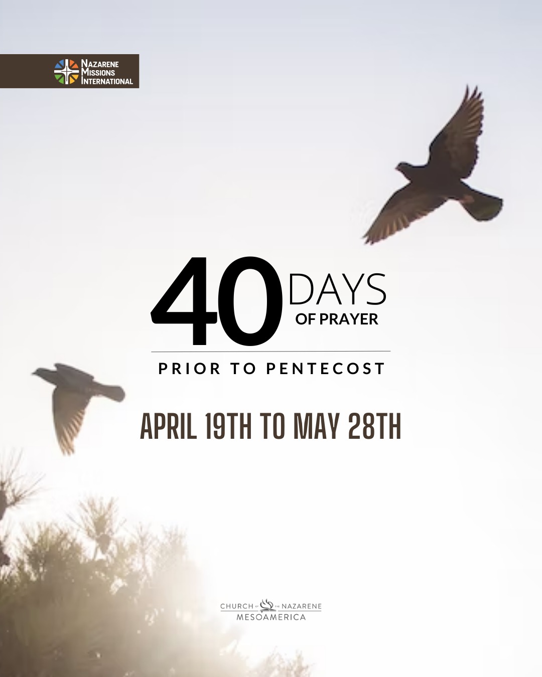 Starting today, April 19, 2023, Nazarene Missions International in the Mesoamerica Region is calling all Nazarenes to intercede in the next 40 days for an outpouring of the Holy Spirit on our churches and nations. An overview of the campaign is provided below, and the entire devotional plan can be accessed at the link below. Would you join with us in praying and fasting as we expect great things from God on and after Pentecost Sunday?