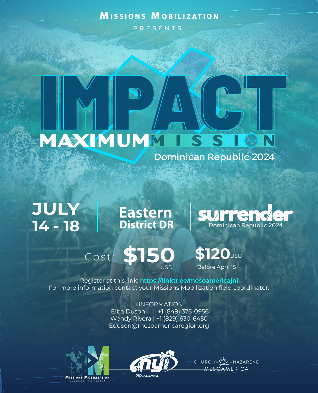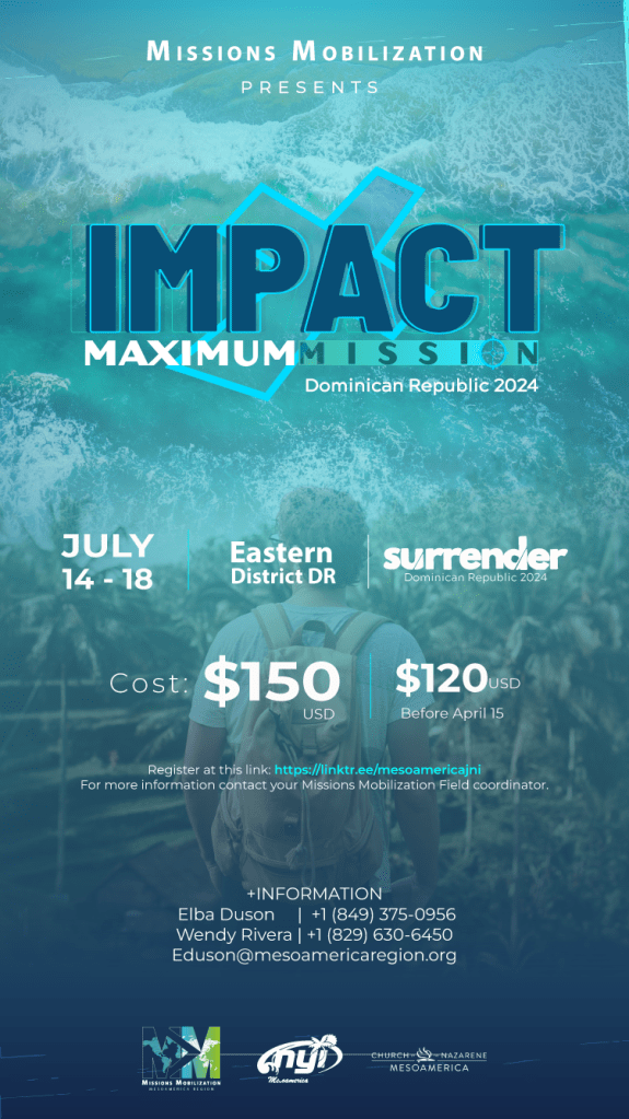 Our teens and youth leaders have been excited for months about SURRENDER, the Mesoamerica Regional Youth Congress that will take place July 18-21, 2024 in Punta Cana, D.R. In conjunction with our Nazarene Youth International leaders, we in Missions Mobilization have prepared a missions trip that will take place in the eastern part of the Dominican Republic the week before SURRENDER. Maximum Mission: Impact DR is designed for any young person or leader who would like to serve in urban settings before the Congress (although anyone can participate, even if not registered in the event in Punta Cana). We have space for up to 100 people, and expect there to be more than 10-12 cultures and countries represented. The registration information is below, and can also be directly accessed here:
